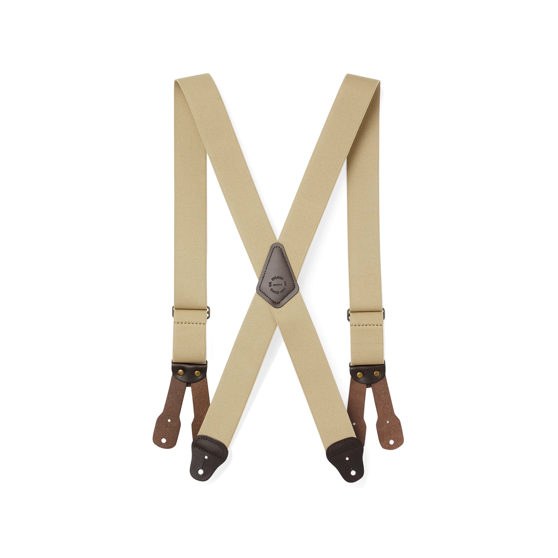 Sometimes it takes more than a belt to keep your cargo in place. These wide elastic suspenders have riveted leather tabs for attaching to suspender buttons and an X-cross design in the back for added durability. Inspired by traditional lumberjack suspenders, each front tab attaches to two buttons while each back tab attaches to one. They feature Filson branding in the front sturdy metal hardware.