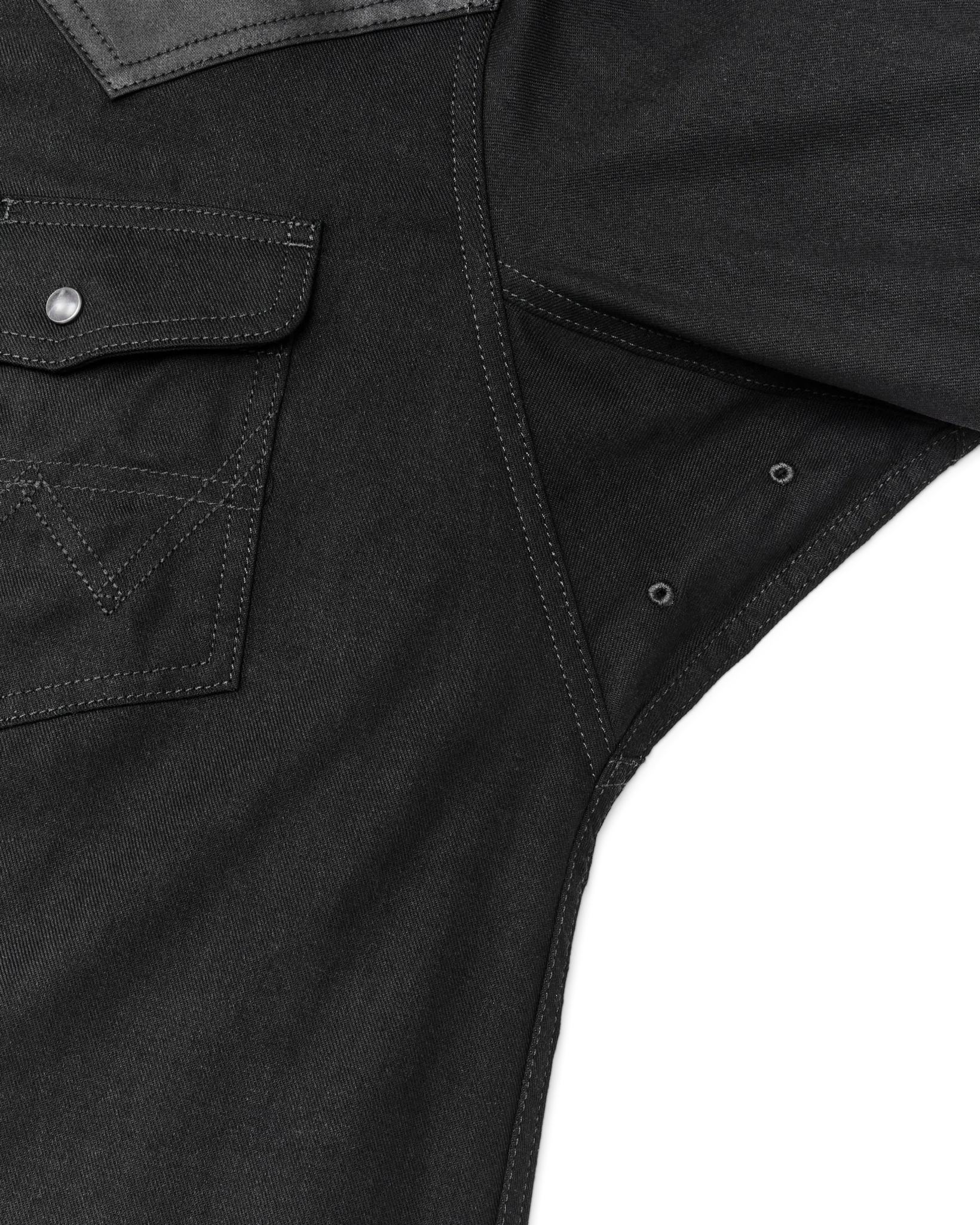 A WESTERN SHIRT IN MEDIUM-WEIGHT DENIM WITH WASHABLE WAXED-COTTON SHOULDER OVERLAYS.